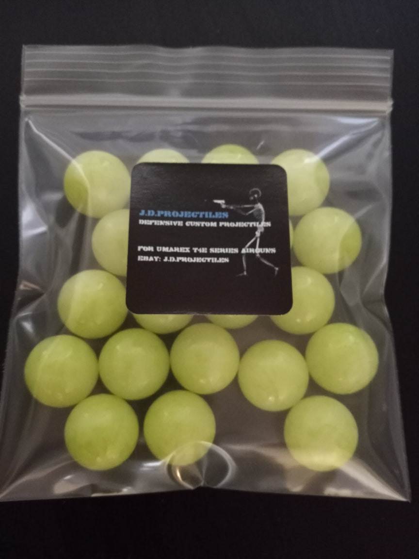 Umarex TR68/ HDR.68/ HDS.68 Polymer Zombie balls. Comes in a bag of 20 count. Fast velocity, hard hitting impact. 3.6 Gram/ 56 Grains. Reusable, washable, rinse and reload them. High visibility Zombie green color. Good for long distance visibility- easily recovered indoors and outdoors. Zombie green coating may wear with time. Happy shooting-please use this product responsibly, not a toy, always keep muzzle in a safe direction. Enjoy!!